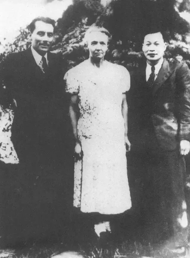 图:钱三强(右一)与约里奥·居里夫妇合影