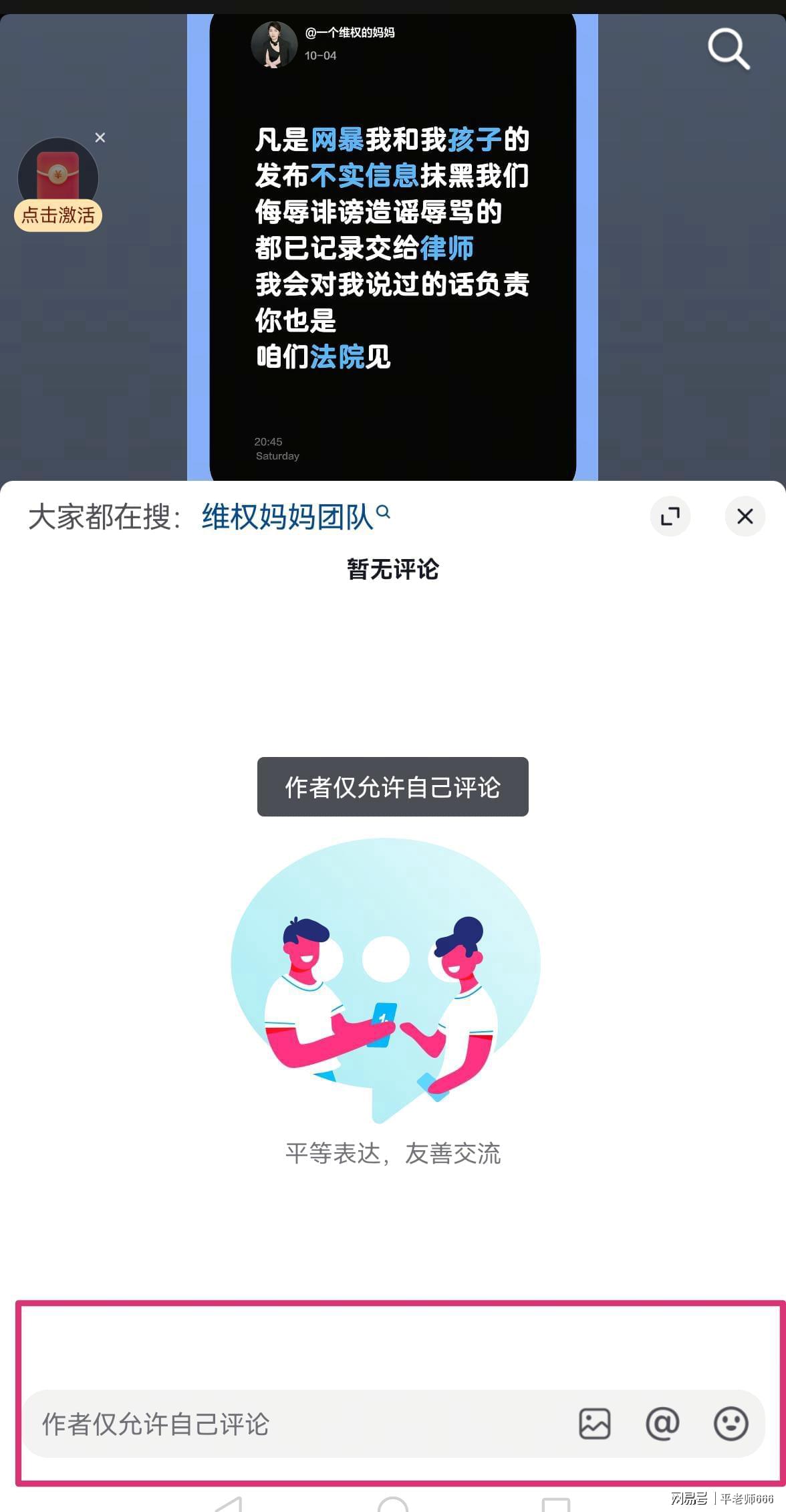 网络有部分网友对付女士进行批评,在付女士看来,这是网友对她的诽谤和造谣,她删除了某音平台所有视频只留下一段话,她已经收集了证据提交给律师,要和网友对簿公堂,进一步起诉网友。