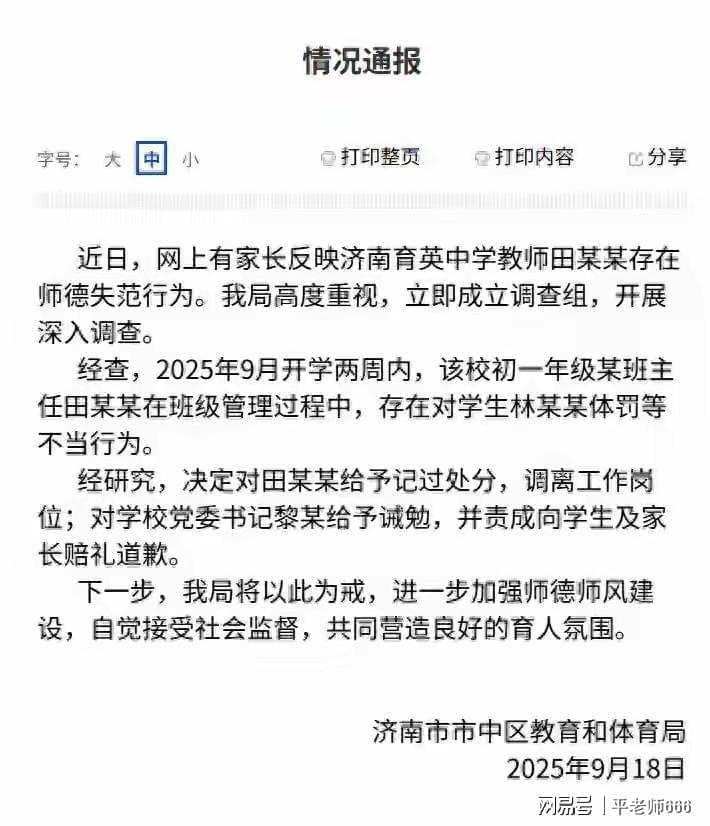 济南市市中区教体局根据以师德失范为理由对田老师和党委书记作出如下处理,决定对田某某给予记过处分,调离工作岗位;对学校党委书记黎某给予诫勉,并责成向学生及家长赔礼道歉。